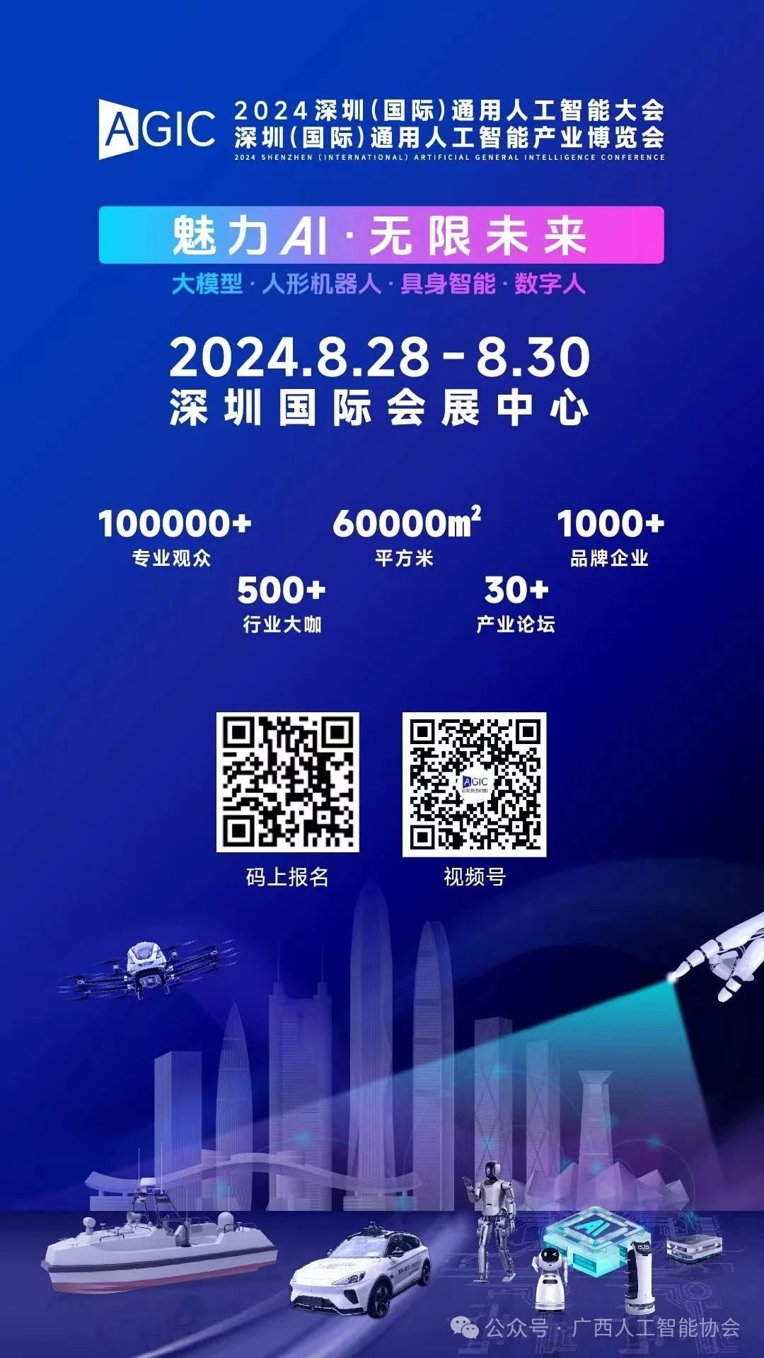 8月28日至30日,2024深圳(国际)通用人工智能大会暨深圳(国际)通用人工智能产业博览会将在深圳国际会展中心(宝安)举办。大会以“魅力AI·无限未来”为主题,致力于打造全球通用人工智能领域集产品呈现、产业展览、技术交流、学术论坛于一体的世界级人工智能合作交流平台。本次大会暨博览会由工业和信息化部政府采购中心、广东省工商联、前海合作区管理局、深圳市工信局等单位指导,深圳市人工智能产业协会主办,得到了华为、腾讯、优必选、中煤科工、中国联通、云天励飞、考拉悠然、智航、力维智联等国内人工智能企业的深度参与和大力支持。