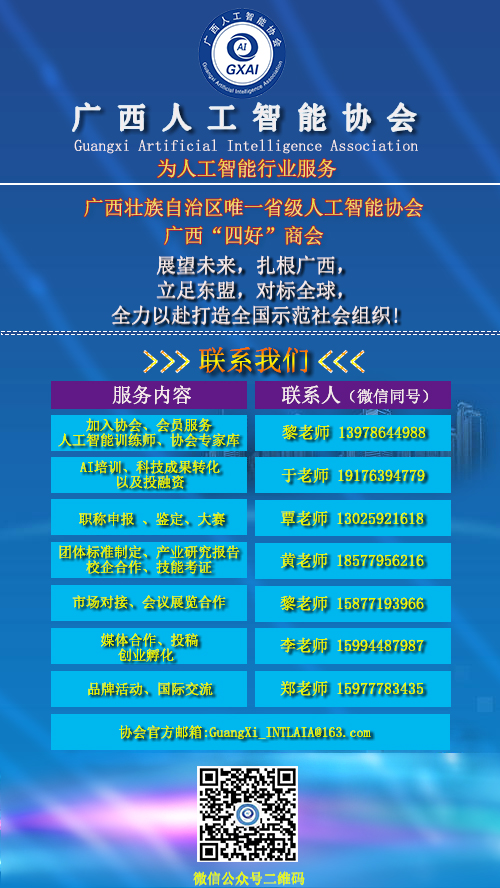 广西人工智能协会成立于2019年,是在党的领导下,贯彻党的科技政策方针路线,由高校、科研院所和相关机器人工厂企业等组成的,以为人工智能产业服务为宗旨,将AI产业化、产业AI化为任务的社会团体。协会与广州、深圳、上海、北京、杭州、大连等国内人工智能产业发展的先进地区,建立了牢固的产业发展联盟合作关系。业务范围:5G大数据、人工智能机器人、工业互联网、AI+智慧城市、AI+智慧交通、AI+智慧应急、AI+智慧消防、AI+智慧水利(水务)、AI+智慧国土、AI+智慧工业园、AI+智慧矿山、AI+智慧党建、AI+智慧公安、AI+智慧医疗、AI+智慧社区、AI+智慧市政、AI+数字展厅、AI+智慧教育、AI+智慧养老、AI+智慧旅游、AI智慧大健康大数据平台、AI智慧教育实训室平台、中国东盟(广西)AI智慧健康心理运营中心平台、AI虚拟仿真实训室等。